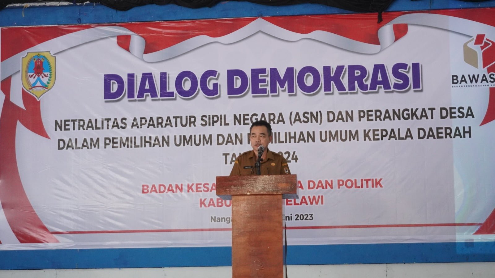 Sekretaris Daerah Kabupaten Melawi, Drs. Paulus mengingatkan Aparatur Sipil Negara (ASN) dan Perangkat Desa di Kabupaten Melawi untuk menjaga netralitasnya dalam menghadapi Pemilihan Umum dan Pemilihan Kepala Daerah Tahun 2024 mendatang. Hal tersebut disampaikan Sekda saat membuka kegiatan Dialog Demokrasi Netralitas Aparatur Sipil Negara (ASN) dan Perangkat Desa dalam Pemilihan Umum dan Pemilihan Kepala Daerah Tahun 2024 di Graha Sukiman Center, Nanga Pinoh, Selasa (13/06/2023).